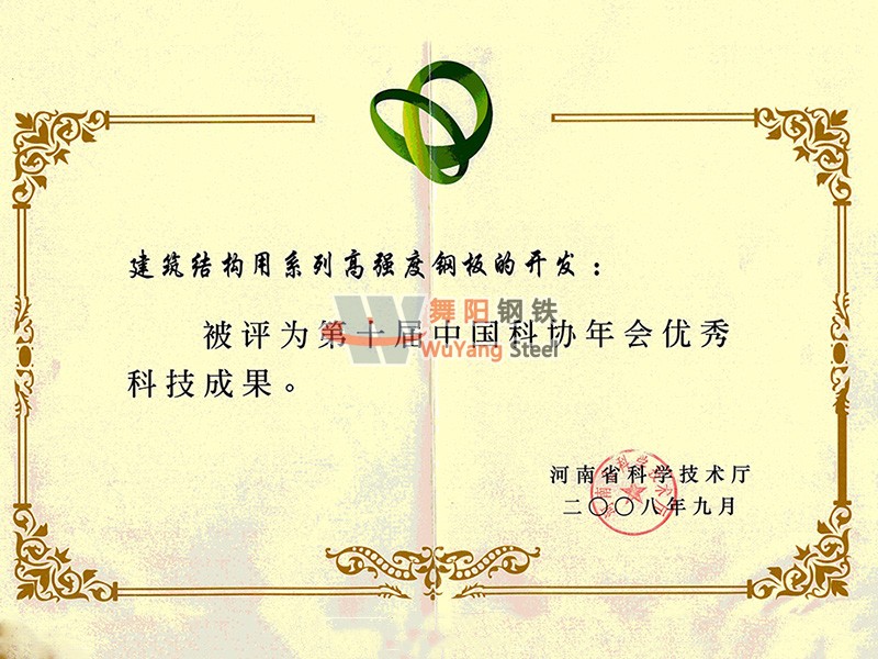 舞陽(yáng)鋼鐵公司-建筑結(jié)構(gòu)用系列高強(qiáng)度鋼板的開發(fā)被評(píng)為第十屆中國(guó)科協(xié)年會(huì)優(yōu)秀科技成果